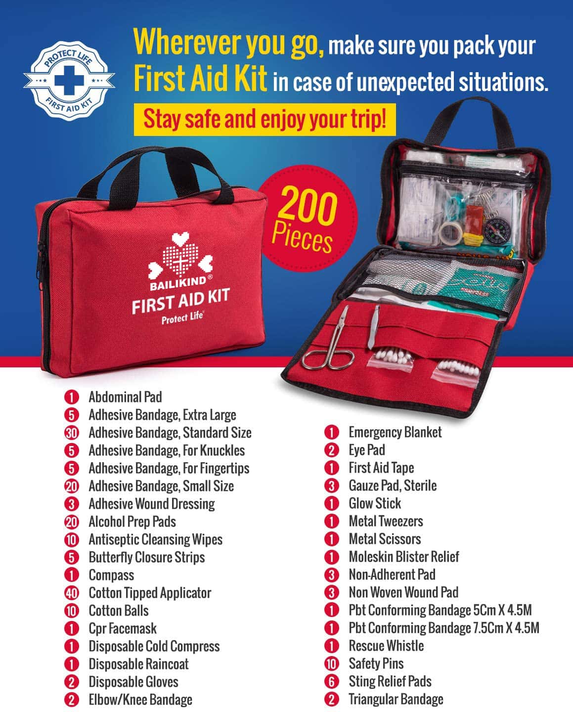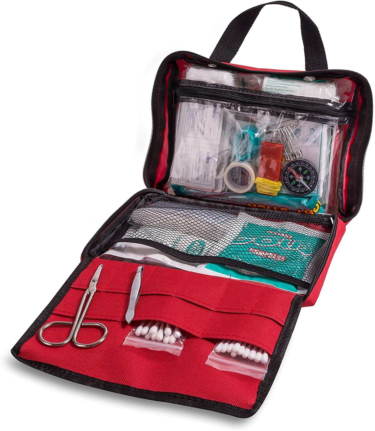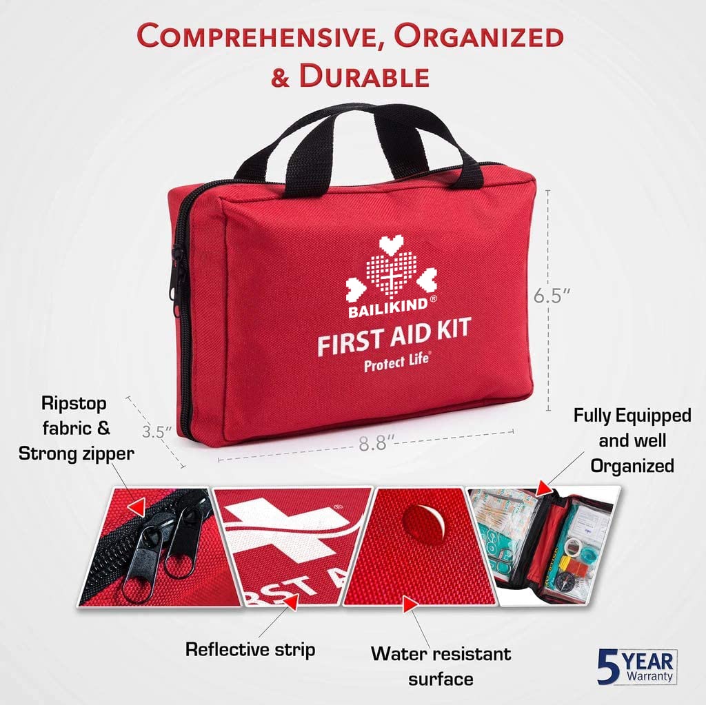 DURABLE RIPSTOP مواد (8.8 "x 6.5" x 3.5"، صرف 1.4 پائونڊ وزن آهي). مضبوط، ٺهڪندڙ ۽ کڻڻ ۾ آسان، اڃا تائين سڀني بنيادي امداد ۽ تياري واريون شيون رکي ٿو (مجموعي طور تي 200 ٽڪر). compartments ۽ اڃا به اضافي جاء آهي وڌيڪ ذاتي شيون شامل ڪرڻ لاء.